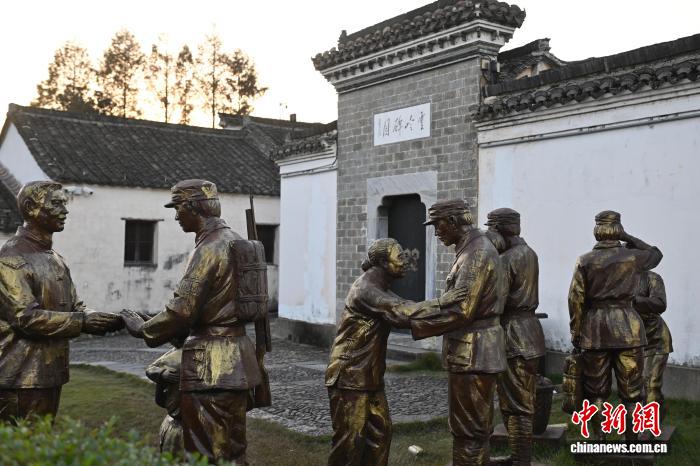 11月19日,安徽泾县的新4军军部原址摆设馆院内乱的雕刻。新4军军部原址留念馆位于安徽宣乡泾县云岭镇,现存年夜礼堂等11处原址,经由过程本状陈设取博题铺览,表现新4军正在云岭时代的战争取死活场景。(无人机相片)中新社记者 韩苏本 摄